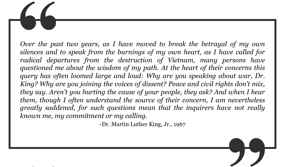 King, Dr. Martin Luther. “Beyond Vietnam: A Time to Break the Silence.” Information Clearinghouse. Web. 2 Apr 2015. http://www.informationclearinghouse.info/article2564.htm