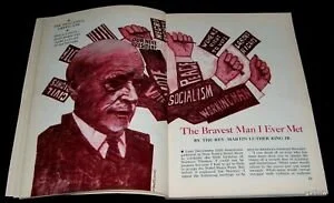 America’s focus over the last decades on a superficial and moderate version of King has, perhaps unsurprisingly, also consistently overlooked the emphasis he placed — especially in his later years — on economic democracy and an effort to end poverty for people of all colors. In 1965, King published an article for Pageant magazine entitled, “The Bravest Man I Ever Met,” celebrating the Presbyterian minister and six-time socialist presidential candidate Norman Thomas — and suggesting Thomas be appointed America’s ambassador to the United Nations. Here, he quotes the white socialist leader at length, giving some insight into the aspects of Thomas’s character which King found to be so compellingly brave: “The hope for the future lies in a new social and economic order which demands the abolition of the capitalist system. War itself is only the most horrible and dramatic of the many evil fruits of our present organized system of exploitation and the philosophy of life which exalts competition instead of cooperation.” King would echo in his own words this call to transform our domestic and global economic system — but, situated within America’s McCarthy-era anticommunist hysteria, he was aware of the political risk involved in openly association with the cause of socialism. King privately identified as a democratic socialist for much of his adult life. According to an anecdote related by Cornel West in a 2015 speech, Coretta Scott King told him the first time they met, “You know, when Brother Martin Luther King Jr. first took me out on a date, he said to me, ‘I’ll be you never met a Black socialist before.’ That’s 1952.”